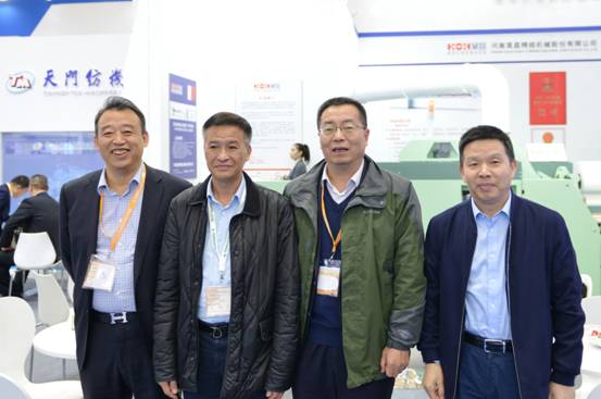 中紡聯(lián)黨委書(shū)記、秘書(shū)長(zhǎng)高勇(左3)、中紡聯(lián)副會(huì)長(zhǎng)楊紀(jì)朝(右2)、中國(guó)紡織機(jī)械協(xié)會(huì)總工程師祝憲民(左1)在天門(mén)紡機(jī)展位上合影