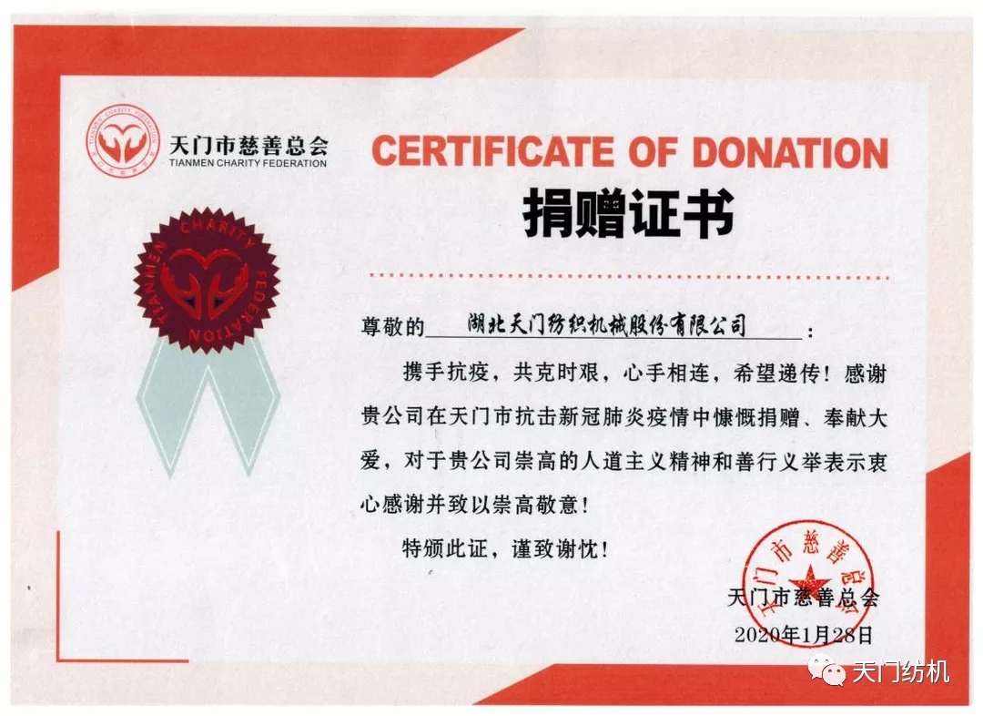 2020年,面對(duì)來(lái)勢(shì)洶洶的新冠疫情,作為一家民營(yíng)企業(yè),天門(mén)紡機(jī)不計(jì)經(jīng)濟(jì)損失,率先提出了“不給黨和政府添麻煩,不給疫情防控添壓力,不給社會(huì)就業(yè)添負(fù)擔(dān)”,率先停產(chǎn)歇業(yè),率先捐贈(zèng)100萬(wàn)元,專(zhuān)門(mén)用于收治新冠患者,采購(gòu)短缺醫(yī)療物資。公司管理層還通過(guò)多種渠道,主動(dòng)與有影響力基金會(huì)取得聯(lián)絡(luò),分6個(gè)批次向醫(yī)院、社區(qū)捐贈(zèng)了30萬(wàn)只醫(yī)用口罩、10噸醫(yī)用消毒液、2萬(wàn)件防護(hù)服等大量物資,在抗疫的危急時(shí)刻發(fā)揮了重要作用。