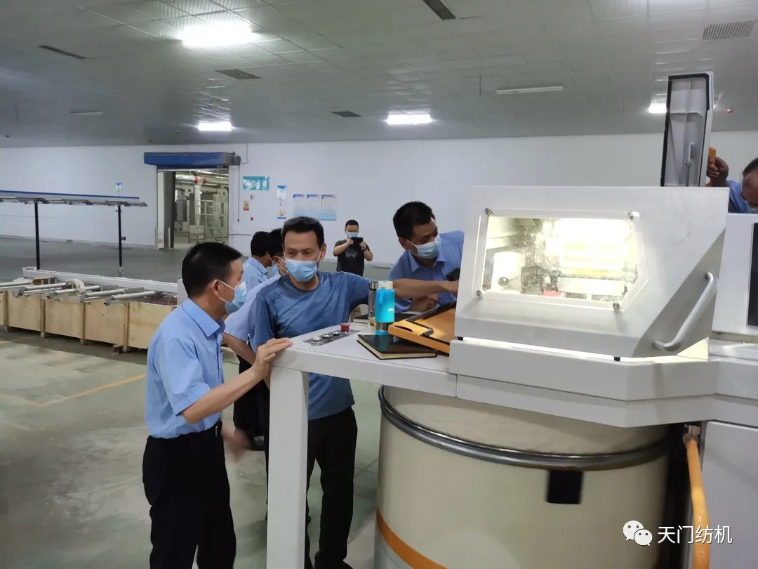 天門紡機(jī)“全球首款超大卷裝雙眼高速自調(diào)勻整并條機(jī)”—TM19自6月份上海展會首次亮相后,已布點在不同客戶處并線試紡3月有余。為了解該機(jī)并線后的真實使用情況,9月18日,天門紡機(jī)董事長沈方勇、總經(jīng)理焦倫進(jìn)帶領(lǐng)技術(shù)研發(fā)人員組成的TM19評估組,專程赴卓爾天龍紡織公司,現(xiàn)場考察實際使用情況,征求客戶意見建議。