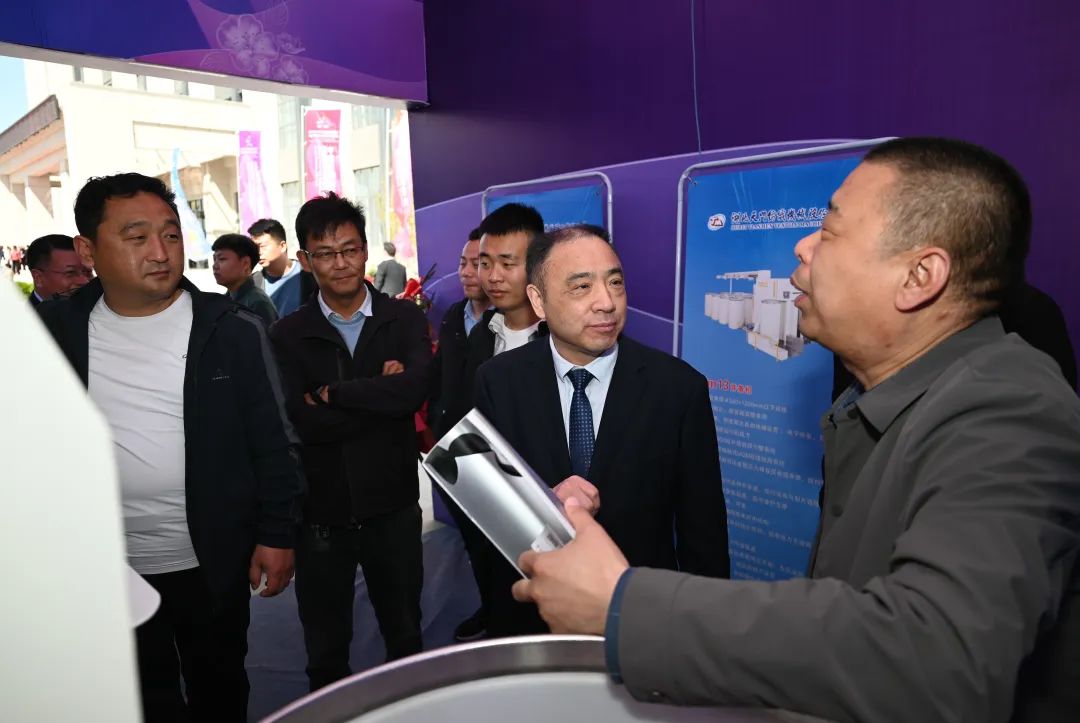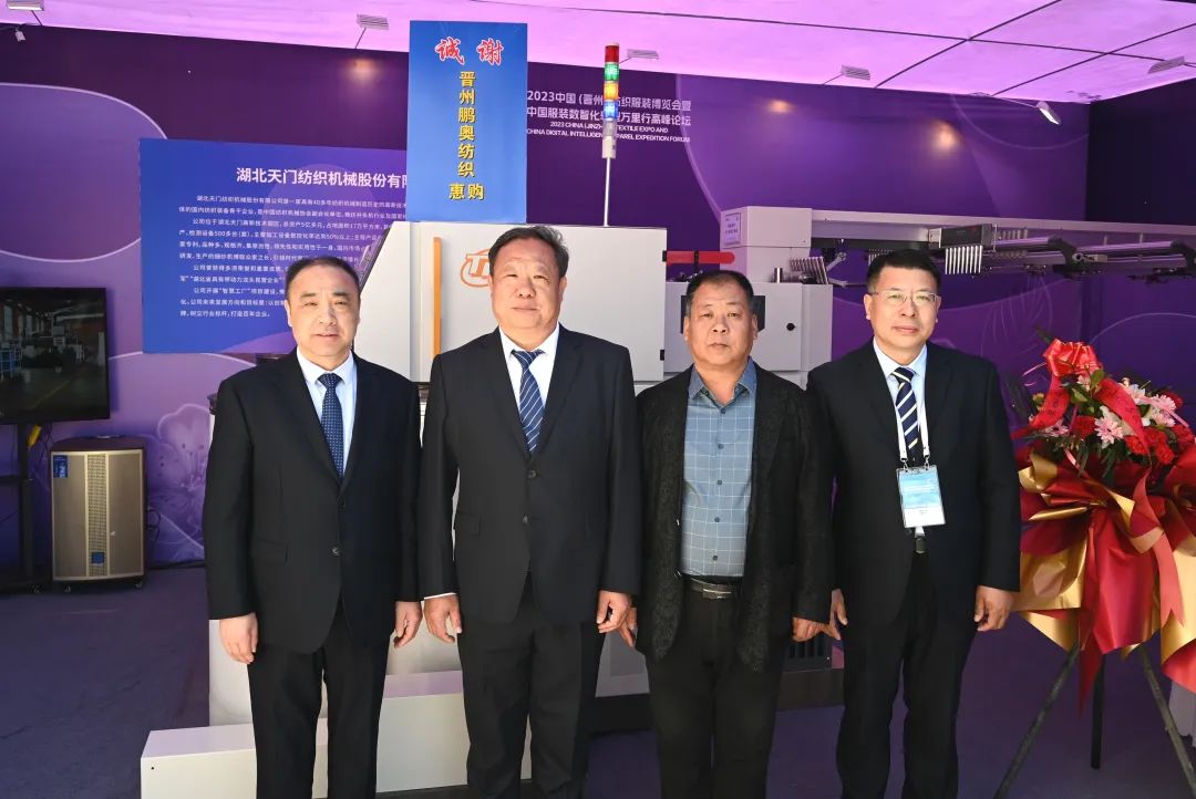 天門紡機(jī)總經(jīng)理焦倫進(jìn)向蒞臨公司展位的晉州市長王林(右2)、中國服裝協(xié)會常務(wù)副會長楊金純(右1)、晉州市紡織服裝行業(yè)協(xié)會會長李永強(qiáng)(左1)介紹公司與晉州紡織企業(yè)合作情況