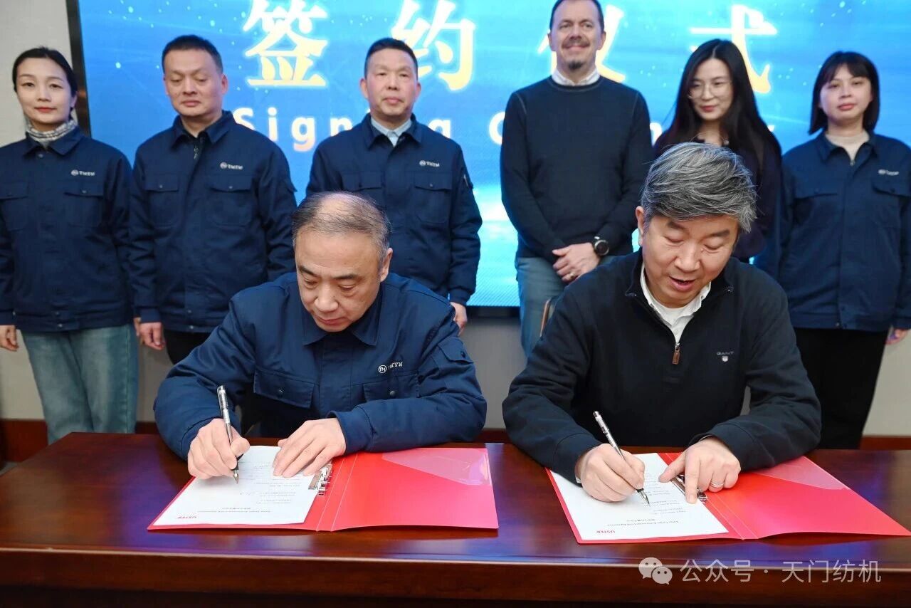 會(huì)議現(xiàn)場(chǎng)同步舉行了授牌和簽約儀式,沈方勇董事長(zhǎng)代表天門紡機(jī)向?yàn)跛固厥谟?ldquo;2025年度并條技術(shù)合作突出貢獻(xiàn)單位”榮譽(yù)牌匾;公司總經(jīng)理焦倫進(jìn)與烏斯特執(zhí)行副總裁、中國(guó)運(yùn)營(yíng)總裁徐斌簽訂新年合作協(xié)議,雙方的合作邁入新階段。